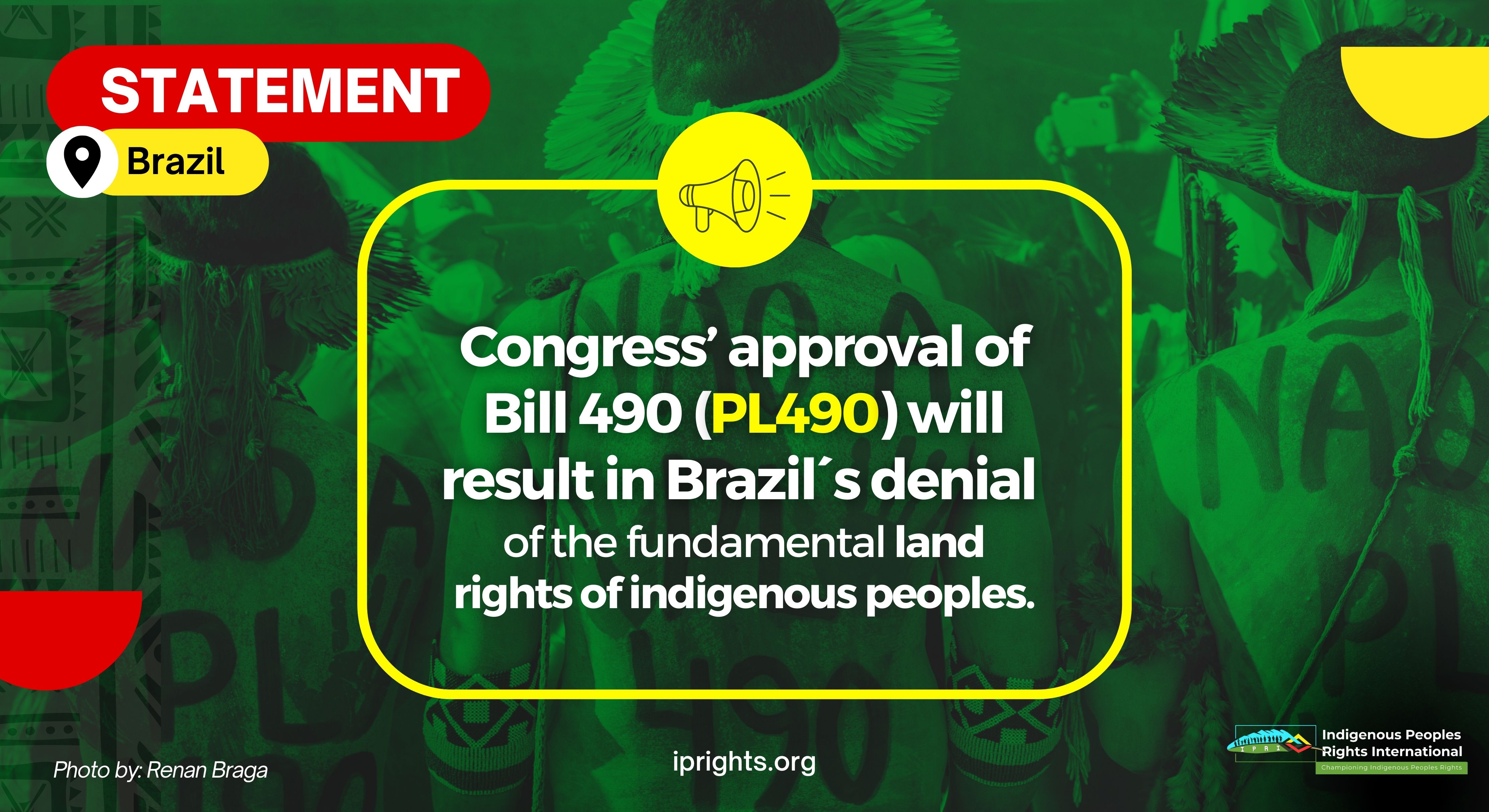 Indigenous Peoples Rights International (IPRI), an international organization for the defence of the rights of Indigenous Peoples,  shares the deep concern expressed by indigenous and civil society organizations regarding the approval of Bill 490 (which includes the Time Frame thesis)  by the Chamber of Deputies in Brasilia last May 24th of 2023.   Bill 490 (PL490) will be voted on next May 30th. It is a dangerous threat to indigenous peoples’ rights and compromises Brazil’s international human rights obligations. If the vote goes through, it will allow the legal dispossession of traditional indigenous lands and the imposition of extractive projects within indigenous territories, without their free, prior, and informed consent, leading to irreversible environmental and cultural impacts and extermination of indigenous peoples. This Bill also seeks to transfer the faculties of indigenous land demarcation from the Executive Branch to the Legislative Branch, diluting the powers of the Environmental and the Indigenous Peoples’ ministries, currently led by an indigenous woman, Sonia Guajajara.  “The transfer of the competence of the indigenous land demarcation to Congress is a dangerous mistake. This measure puts at risk the rights of indigenous peoples and opens space for political influences and economic interests to prevail over ancestral rights.”  – Sonia Guajajara, Minister of Indigenous Peoples The Time Frame thesis arbitrarily establishes that indigenous peoples only have the right to the demarcation of the lands that were in their possession on October 5, 1988 or that were in physical or judicial dispute as of that date. In other words, the recognition and protection of their lands are subjected to the -date of promulgation of the Federal Constitution. “The history of indigenous peoples does not begin in 1988. And our rights cannot be taken away. They are threatening our existence in a genocide legislated in the Chamber with PL 490! It’s time to defend life!” – Celia Xakriabá, indigenous federal deputy This thesis is defended by agribusiness and sectors seeking to exploit the resources on the traditional lands of indigenous peoples. It jeopardizes the demarcation of indigenous lands, including those already demarcated. As pointed out by the former UN Special Rapporteur on the Rights of Indigenous Peoples, Victoria Tauli-Corpuz , the application of a Time Frame thesis is contrary to the rights of indigenous peoples under international human rights law, specifically UNDRIP , and the related standards and jurisprudence of the InterAmerican Human Rights System and the  UN Treaty Bodies.    IPRI observes a worrying setback in the aforementioned demarcation processes and indigenous rights recognition, derived from the deep-rooted racism and anti-Indigenous practices within the Congress, inherited by the Bolsonaro administration.  “The Time Frame is a legislated genocide. A theory that inverts the entire history of Brazil. A bill that violates the Brazilian Constitution. An attack on the rights of Indigenous Peoples. An attack on our greatest possibility for confronting the climate crisis, the Indigenous Lands”- Sonia Guajajara Brazil’s Constitution recognizes some of the fundamental rights of Indigenous Peoples and the country was a pioneer in the demarcation of their territories. The legal recognition of indigenous peoples’ ancestral lands is paramount for the survival of distinct peoples. This initiative, promoted by the powers interested in appropriating the lands that indigenous peoples have preserved for millennia,  represents a dangerous step backward in the international commitments of the Brazilian State, including its capacity to confront climate change.  IPRI would like to call on the Congress of Brazil to: Vote against the adoption of Bill 490 (PL490).  Decline to approve the Time Frame thesis Prevent diluting the mandate and responsibilities of the Ministry of Indigenous Peoples (Ministério dos Povos Indígenas), a historical achievement of the indigenous peoples’ struggle Return to the Ministry of the Environment the control of the rural environmental registry, a key tool in the fight against illegal deforestation and land grabbing, and of water resources. Ensure that Brazil fully complies with its international obligations regarding the full protection and recognition of the rights of indigenous peoples to their lands, territories, resources, and self-determination. Review and discard the upcoming legislative proposals that represent a setback to the respect of the human rights of indigenous peoples in Brazil: Bill 1654/2023 (Mining in ILs); Bill 2633/2020 and Bill 510/2021 (Land Grabbing); Bill 2159/2021 (Changes Environmental Licensing); Bill 177/2021 (allows Brazil to withdraw from ILO Convention 169), among others.   Download statement
