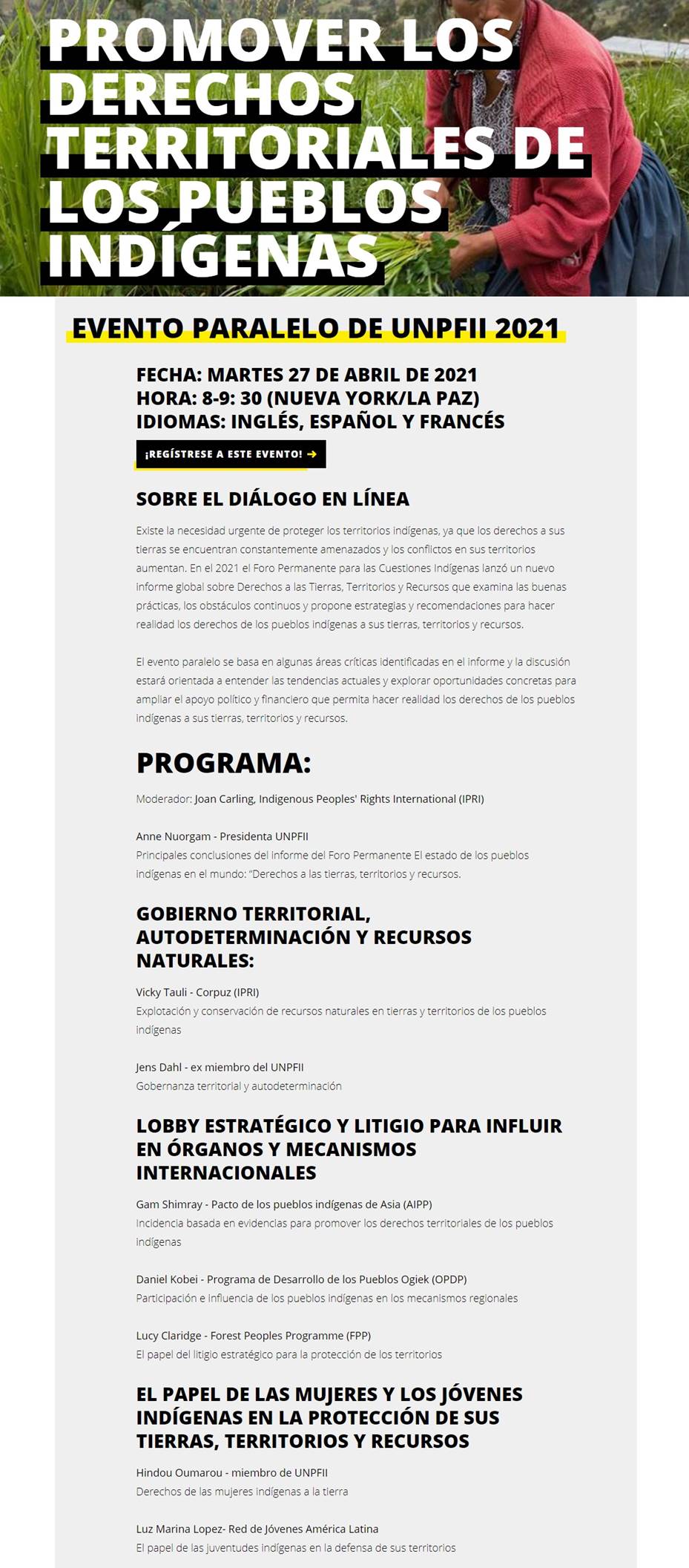 El evento paralelo se basa en algunas áreas críticas identificadas en el informe y la discusión estará orientada a entender las tendencias actuales y explorar oportunidades concretas para ampliar el apoyo político y financiero que permita hacer realidad los derechos de los pueblos indígenas a sus tierras, territorios y recursos.