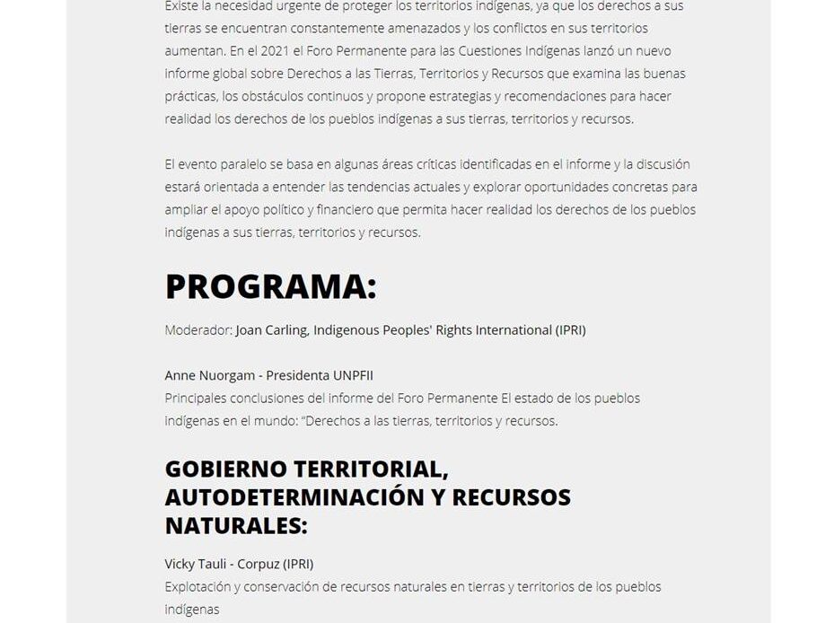 El evento paralelo se basa en algunas áreas críticas identificadas en el informe y la discusión estará orientada a entender las tendencias actuales y explorar oportunidades concretas para ampliar el apoyo político y financiero que permita hacer realidad los derechos de los pueblos indígenas a sus tierras, territorios y recursos.